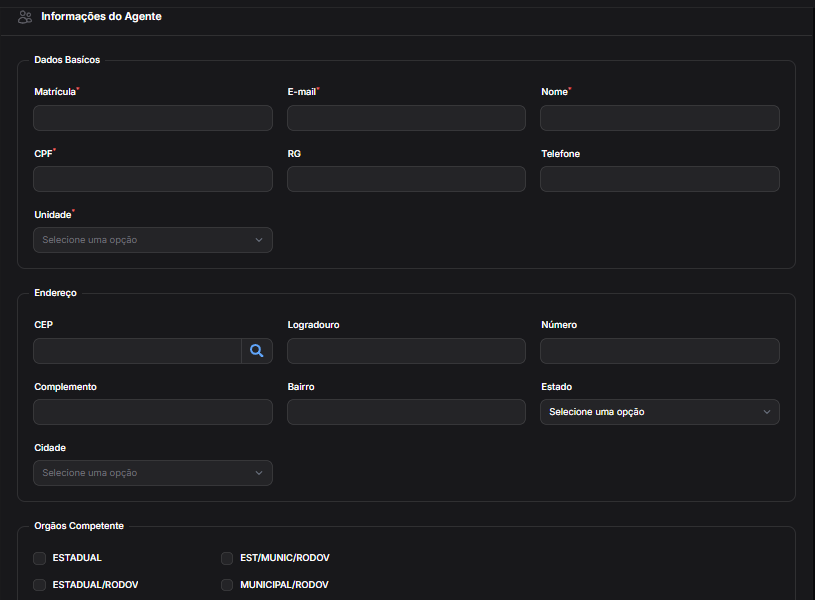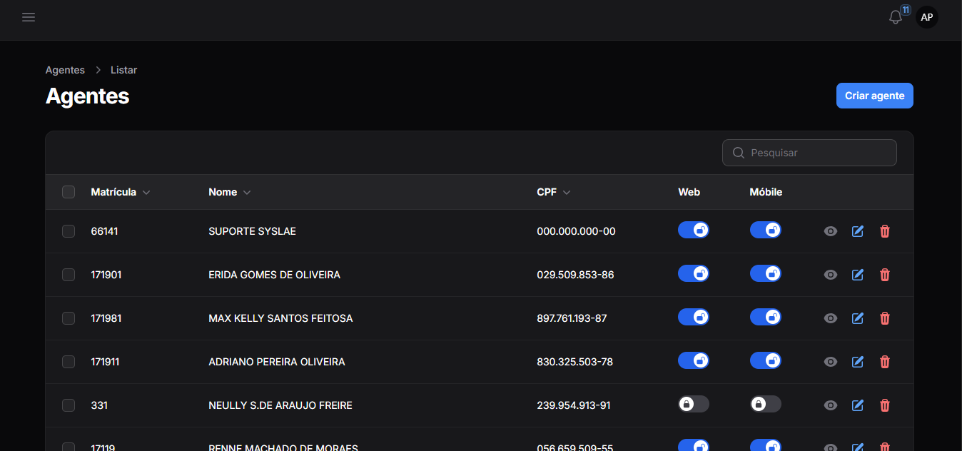Aqui é possível visualizar, cadastrar, editar, permitir acesso e excluir agentes conforme a necessidade da operação.