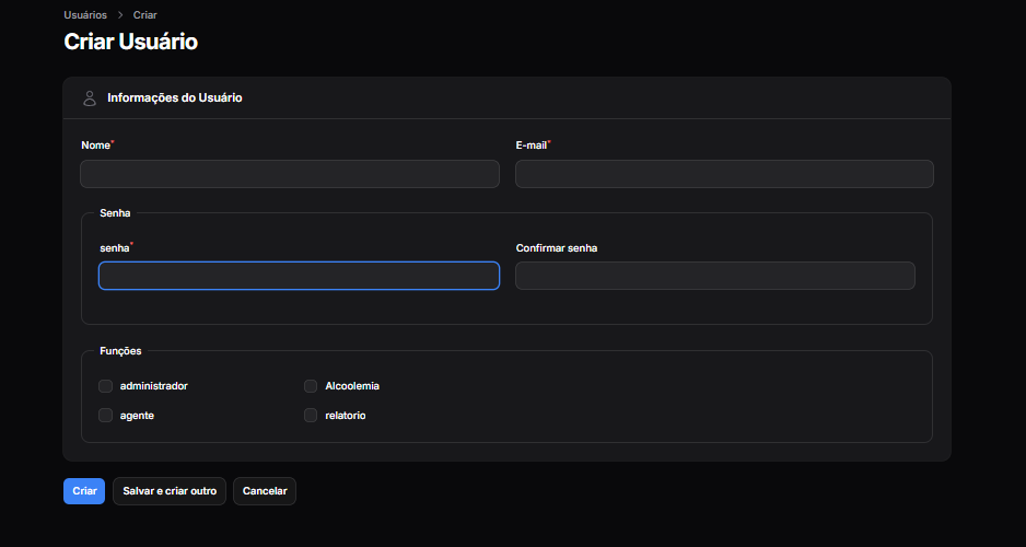 O botão “Criar Usuário” abre o formulário de cadastro onde é possível registrar uma nova conta inserindo:
