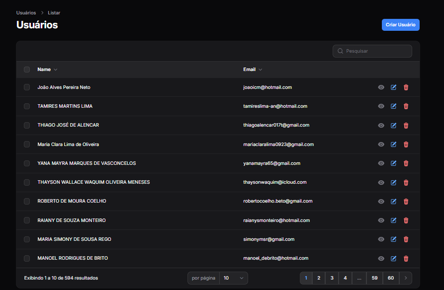A lista permite ordenação por nome e e-mail, facilitando a localização dos usuários.